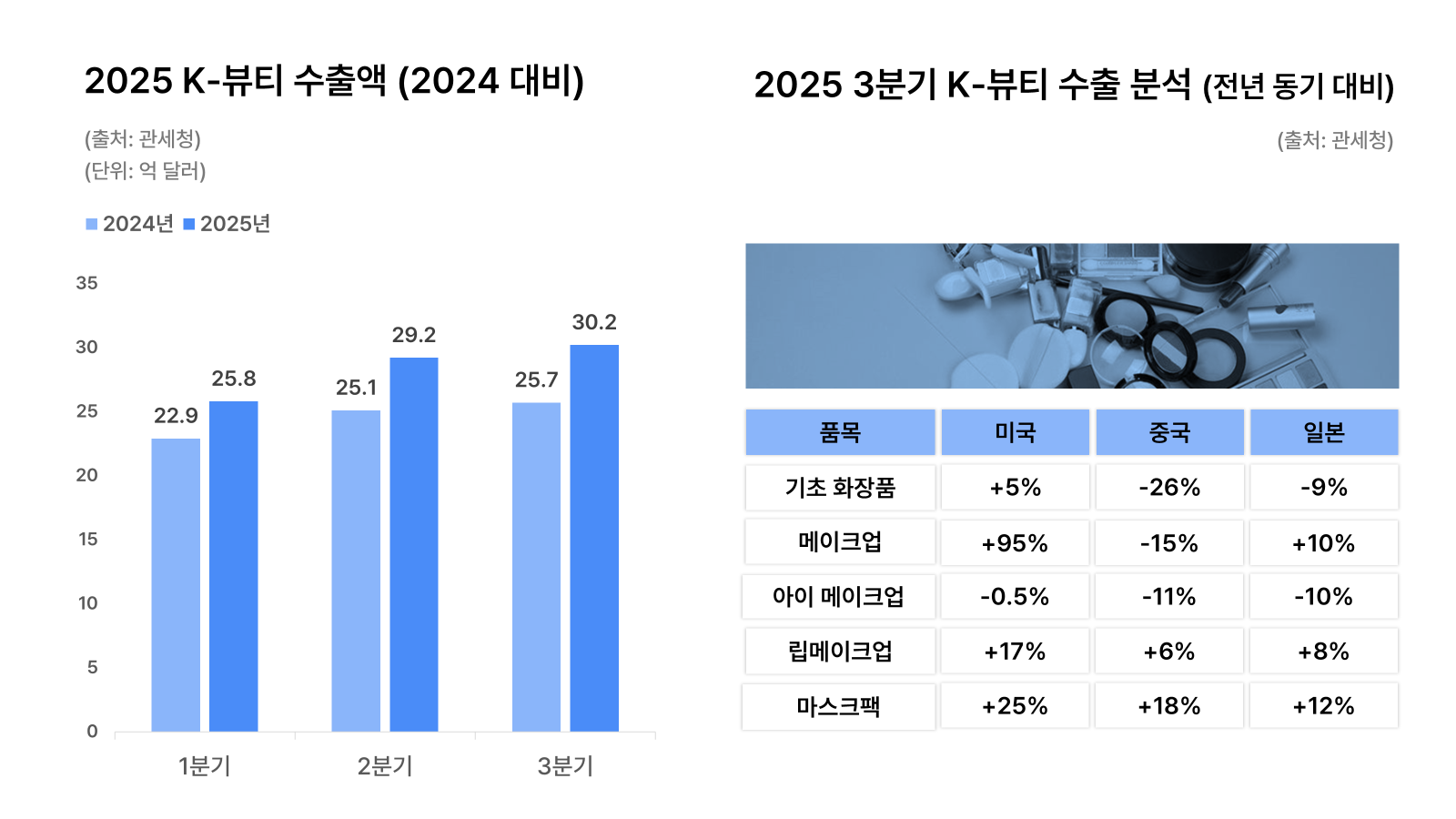 K-๋ทฐํฐ์ ์ต๋ ์์ถ๊ตญ์ด ์ค๊ตญ์์ ๋ฏธ๊ตญ์ผ๋ก ๋ฐ๋๋ฉฐ ๊ธ๋ก๋ฒ ํ๋๊ฐ ์์ ํ ๋ค์งํ์ด์. ์ฌํด 3๋ถ๊ธฐ๊น์ง K-๋ทฐํฐ ์จ๋ผ์ธ ํ๋งค์ก ์ค ๋ฏธ๊ตญ์ด 51%(12์ต ๋ฌ๋ฌ)๋ฅผ ์ฐจ์งํ๋ฉฐ, ์ค๊ตญ(23%)์ ์ ์น๊ณ ์ต๋ ์์ฅ์ผ๋ก ๋ถ์ํ์ด์. K-๋ทฐํฐ์ ์ผ๋ณธ ๋ด ์ธ๊ธฐ๋ ๋งค๋ ๋ ์๋ฆฟ์ ์ฑ์ฅ์ธ๋ฅผ ๊ธฐ๋กํ๋ฉฐ, ๋ ์ด ๊ฐ์๋ก ๋์์ง๊ณ ์์ด์. ์ผ๋ณธ 4๋ ์คํ๋ง์ผ์ธ โํํ ์ฌํฌ(Qoo10 Japan)โ์ ๋ทฐํฐ ์ด์์ฆ ์์ ์ ํ ์ค 87%๋ฅผ ํ๊ตญ ๋ธ๋๋๊ฐ ํฉ์ธ๋ฉฐ ์์ฅ์ ์์ ํ ์ฅ์ ํ์ด์. ์ด๋ K-๋ทฐํฐ๊ฐ ์ค๊ตญ ์์กด๋๋ฅผ ํํผํ๊ณ , ํธ๋ ๋ํ ์ ํ๋ ฅ๊ณผ ๊ฐ์ฑ๋น๋ฅผ ์์ธ์ ์๊ตฌ๊ถ๊ณผ ์ผ๋ณธ ์ฃผ๋ฅ ์์ฅ์ ์ฑ๊ณต์ ์ผ๋ก ์์ฐฉํ์์ ์๋ฏธํด์.