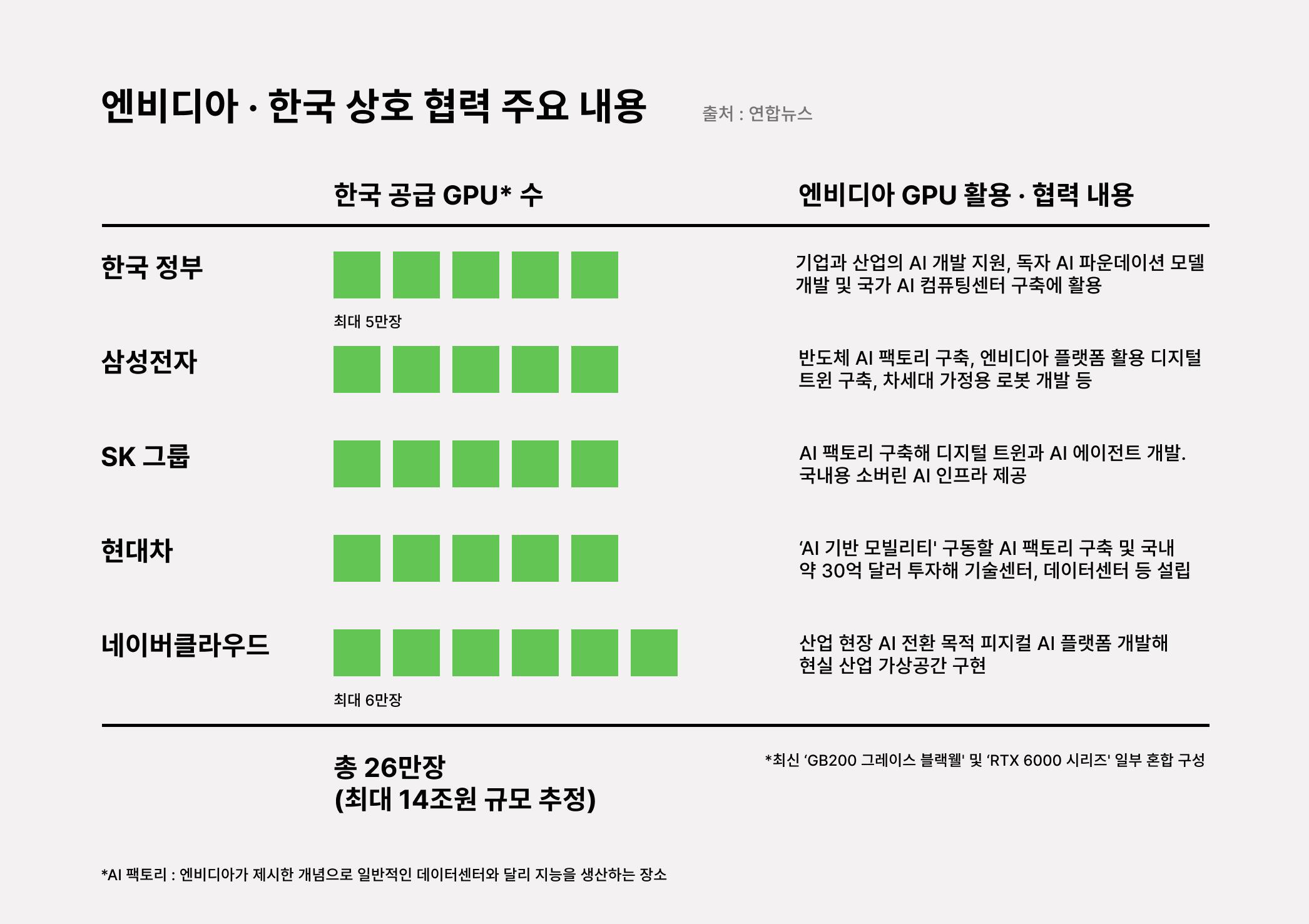 엔비디아는 이번 방한에서 한국에 GPU 26만 장을 공급하겠다고 발표했어요. 이는 최신 블랙웰(GB200) 모델로, 공급 규모는 약 10조~14조 원으로 추산돼요. 정부와 삼성, 현대차, SK, 네이버클라우드가 각각 GPU를 도입해 ‘AI 팩토리’를 구축할 예정이에요. 이로써 한국은 미국과 중국에 이어 세계 3위 GPU 보유국으로 도약하게 됐어요. 이 협력은 대기업 간 기술 제휴를 넘어, 국내 팹리스와 전장 스타트업에도 새로운 기술 수요와 투자 기회를 확산시킬 것으로 기대돼요. 결국 삼성과 엔비디아의 동맹은 차세대 AI 생태계의 출발점이 됐어요.