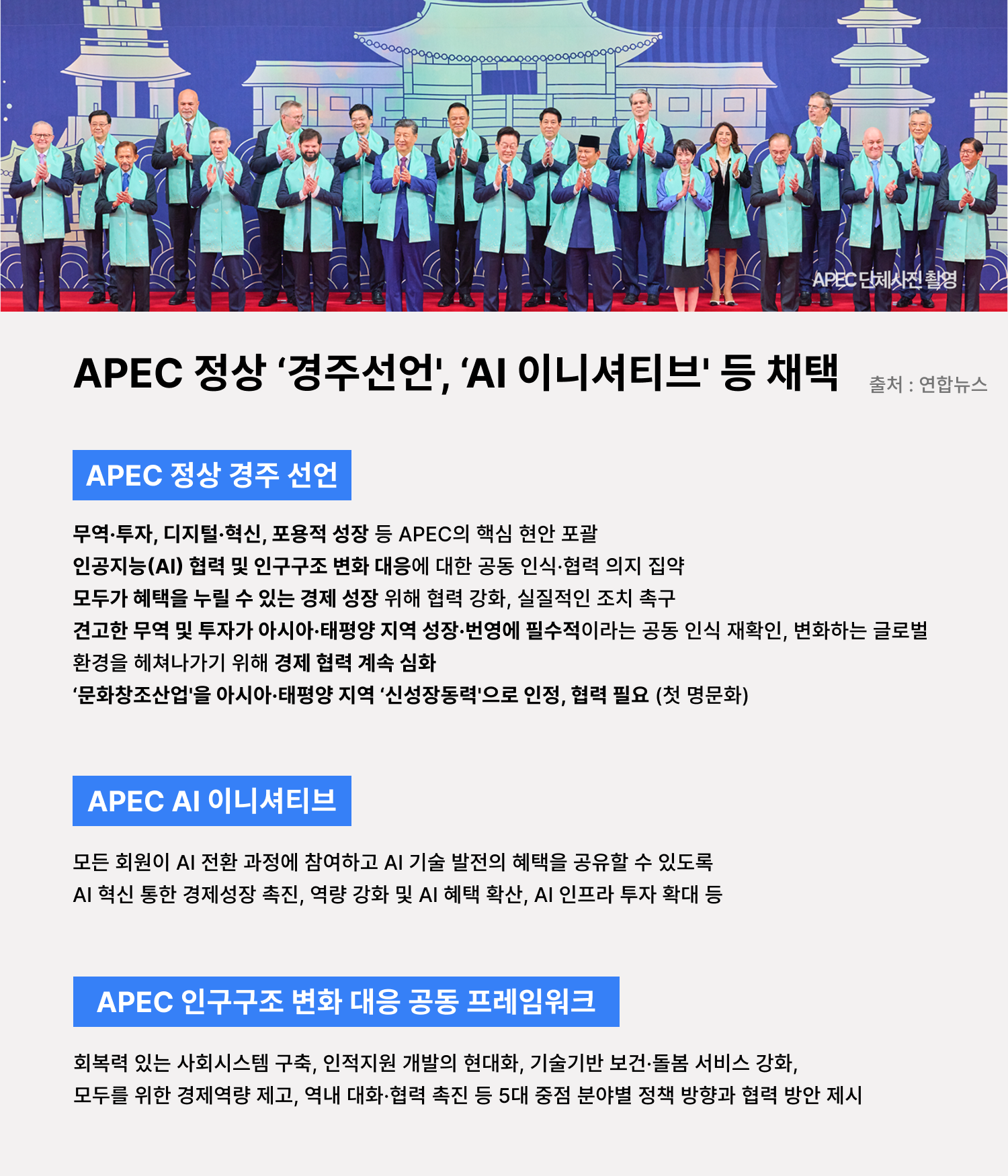 경주에서 열린 2025 아시아태평양경제협력체(APEC) 정상회의가 1일 마무리되며, 회원국들은 연대와 협력 정신을 담은 ‘경주선언’을 비롯해 ‘APEC AI 이니셔티브’, ‘APEC 인구구조 변화 대응 공동 프레임워크’ 등 3개 문서를 채택했어요. 올해 의제인 ‘연결·혁신·번영’을 중심으로 무역·투자, 디지털 전환, 포용적 성장 논의가 진행됐고, 특히 문화·창조 산업을 처음 공동 문서에 명시해 새로운 성장 동력으로 인정했어요.