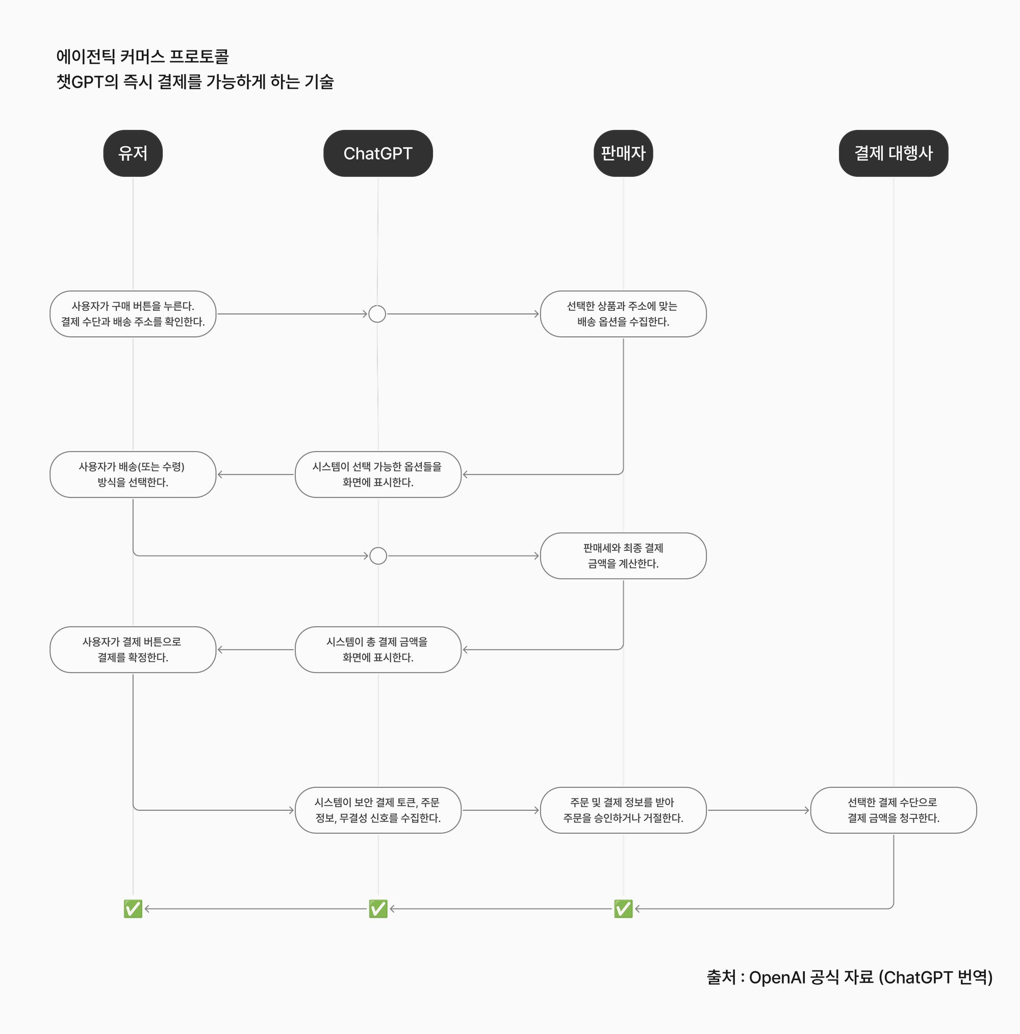 이 프로토콜의 강점은 결제 통합성과 확장성에 있어요. 스트라이프를 사용하는 판매자는 한 줄의 코드만 추가하면 즉시 결제를 활성화할 수 있고, 다른 결제업체를 이용하는 기업도 공유 결제 토큰 API를 통해 시스템 변경 없이 참여할 수 있다고 해요. 덕분에 향후 카카오페이·네이버페이·토스페이 등 국내 간편결제 서비스도 ACP에 쉽게 연결될 수 있을 전망이에요. 오픈AI는 이 구조를 통해 “판매자가 결제·시스템·고객 데이터를 직접 통제하면서도 수억 명의 잠재 고객과 연결될 수 있다”고 설명했어요.