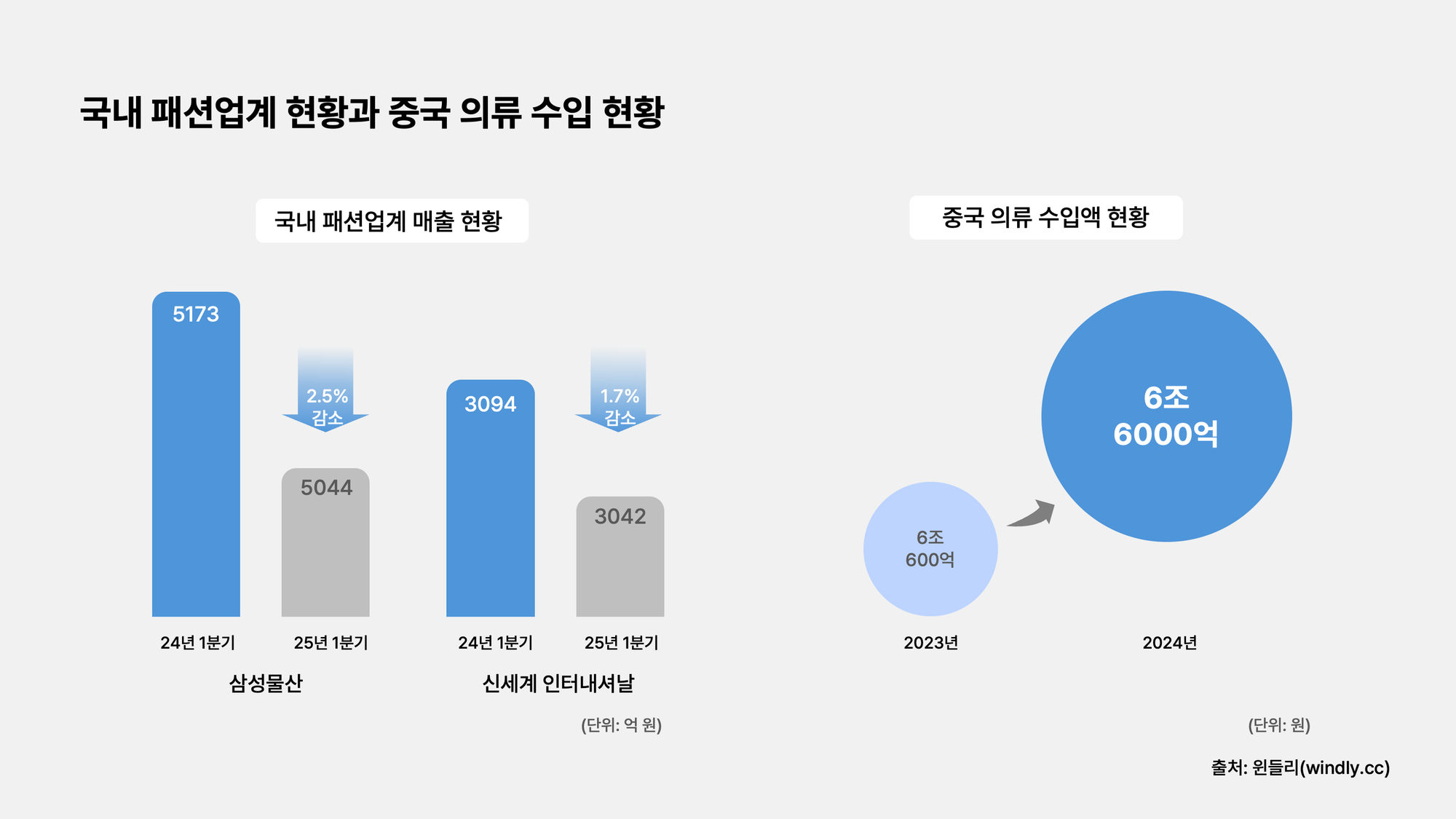 최근 패션 업계가 전반적으로 침체라는 말 들어보셨나요? 계속되는 내수 부진 속에서 사치재로 구분되는 의류 소비가 지속적으로 감소하고 있는데요. 실제로 국내 패션과 의류를 대표하는 삼성물산 패션부문과 신세계 인터내셔날, 그리고 코오롱 FnC의 올해 1분기 매출은 전년 동기 대비 각각 2.5%, 1.7%, 4.1%씩 감소했어요. 국내 패션 시장이 난황을 겪고 있는 가운데, 반대로 고공행진을 기록하는 분야도 있어요. 바로 ‘중국산 의류’예요.