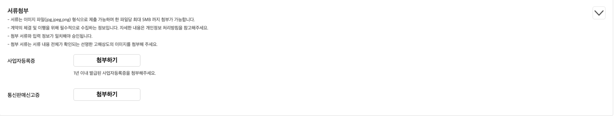 사업자등록번호를 입력하고 나면, 페이지 하단에 “서류 첨부” 항목이 등장해요. 사업자등록증과 통신판매업신고증을 각각 첨부해주세요.
