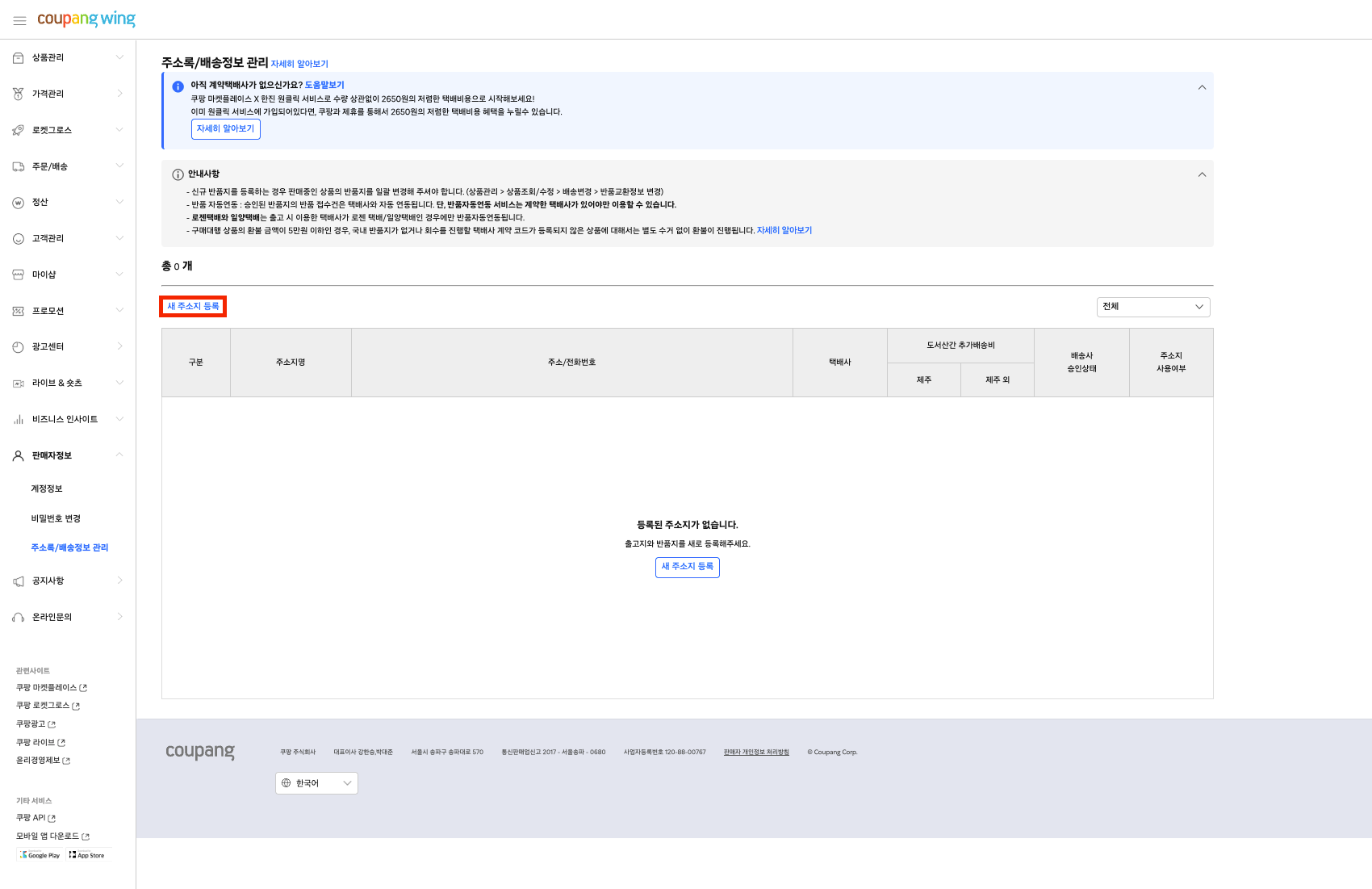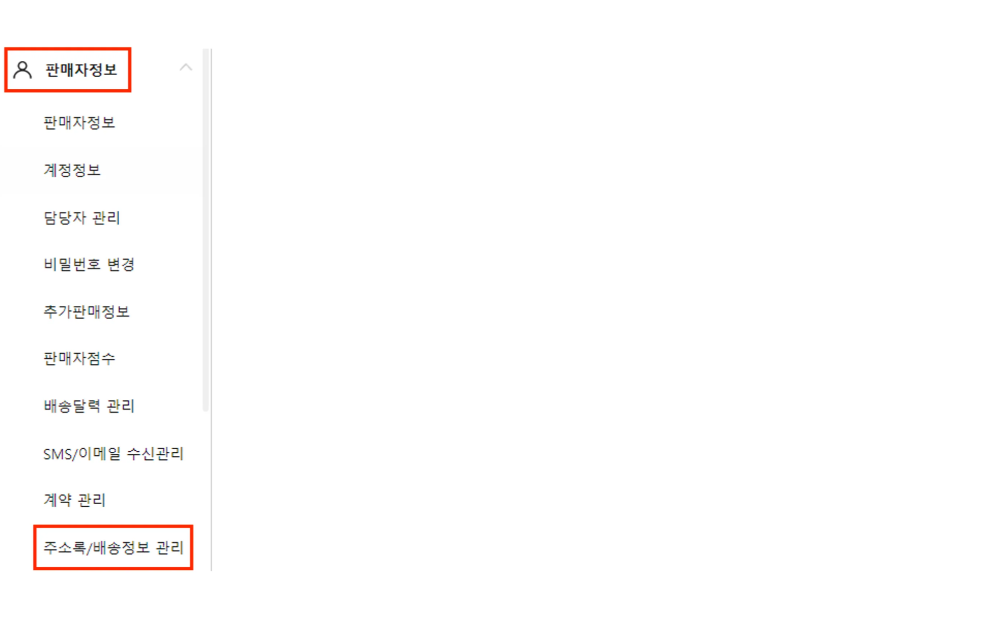 좌측 메뉴에서 “판매자 정보”를 클릭하신 뒤, “주소록/배송정보 관리”를 클릭해 주세요