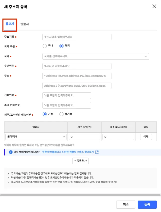 출고지는 상품이 출고되는 곳, 즉 물건이 나오는 장소를 의미해요. 자신의 사업장 주소를 입력하면 돼요.