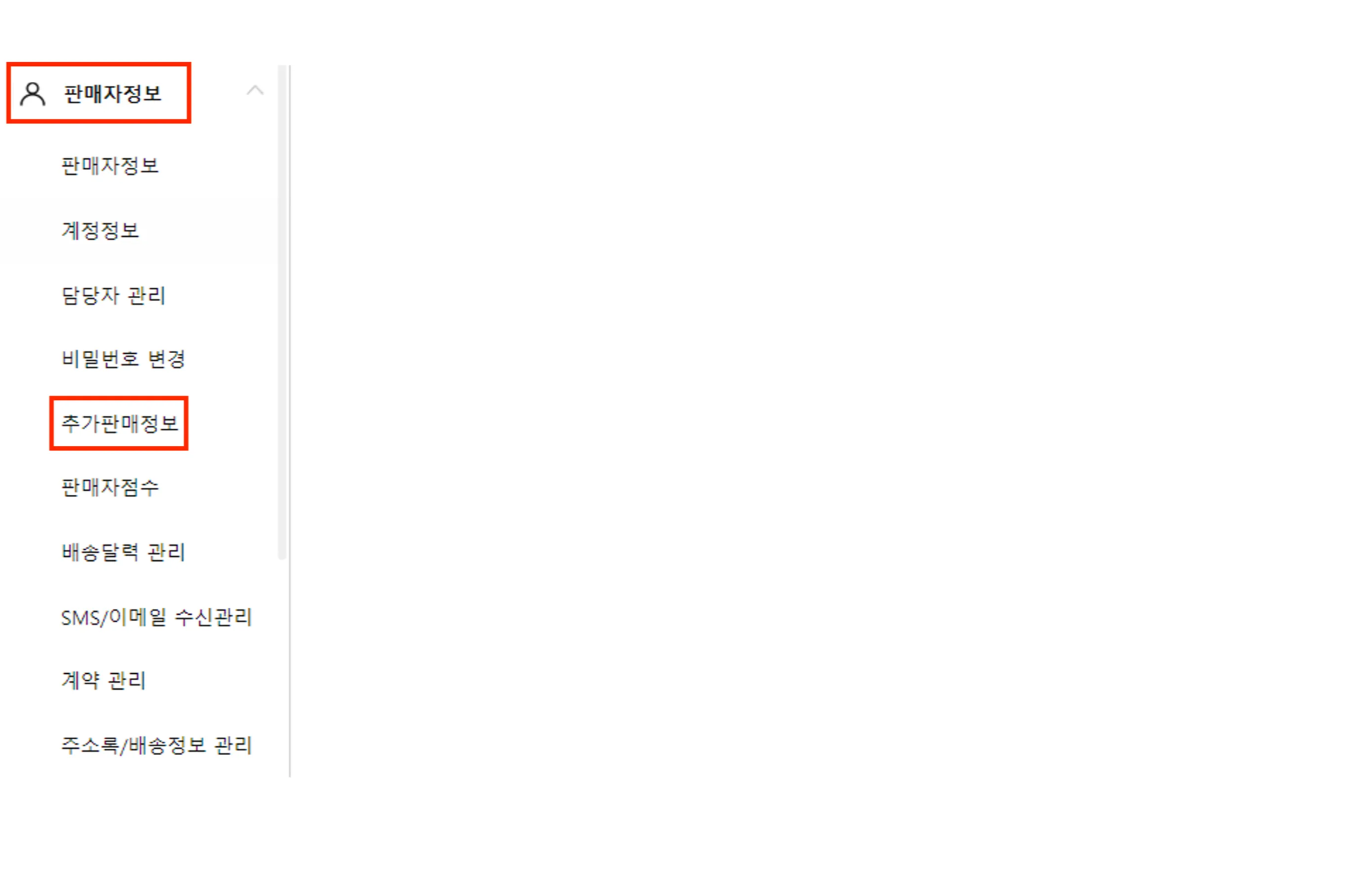 좌측 메뉴에서 “판매자 정보”를 클릭하신 뒤, “추가판매정보”를 클릭해 주세요.
