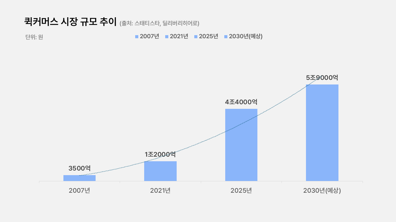 ์ด ๊ฐ์ ์๊ฐ๋ฐฐ์ก ๊ฒฝ์์ ๋น ๋ฅด๊ฒ ์ปค์ง๋ ํต์ปค๋จธ์ค ์์ฅ๊ณผ ๋ง๋ฌผ๋ ค ์์ด์. ์คํํฐ์คํ์ ๋ฐ๋ฅด๋ฉด ๊ตญ๋ด ํต์ปค๋จธ์ค ์์ฅ์ ์ฌํด ์ฝ 31์ต9000๋ง ๋ฌ๋ฌ(์ฝ 4์กฐ4000์ต์)์์ 2030๋ 43์ต ๋ฌ๋ฌ(์ฝ 5์กฐ9000์ต์)๋ก ์ฑ์ฅํ ์ ๋ง์ด๊ณ , ์ฐํ๊ท ์ฑ์ฅ๋ฅ ์ 7.49%์ ๋ฌํ๋๋ฐ์. ๊ฒฐ๊ณผ์ ์ผ๋ก ๋จ์ํ โ๋น ๋ฆโ๋ง์ผ๋ก๋ ๋ถ์กฑํด์ก๊ณ , โ์ ํํ ์๋ น ์๊ฐโยทโ์์ฝ์ฑ ์ฅ๋ณด๊ธฐโยทโ์ฑ ๊ธฐ๋ฐ ์ค์๊ฐ ๊ฒฝํโ์ฒ๋ผ ์๋น์๊ฐ ์ฆ์ ์ฒด๊ฐํ๋ ํธ์์ฑ์ด ๊ณง ๊ฒฝ์ ๋ฌด๊ธฐ๊ฐ ๋ ๊ฐ๋ฅ์ฑ์ด ์ปค์. ๋๊ฐ ๋ฌผ๋ฅยท์ฌ๊ณ ยท๋ฐ์ดํฐ๋ก ์ด ๊ฒฝํ์ ์์ ์ ์ผ๋ก ์ ๊ณตํ๋๋๊ฐ ํต์ปค๋จธ์ค ์ ์ฅ์์ ์นํจ๋ฅผ ๊ฐ๋ฅผ ์ค์ํ ๋ณ์๋ผ๊ณ ๋ณผ ์ ์๊ฒ ์ฃ ?